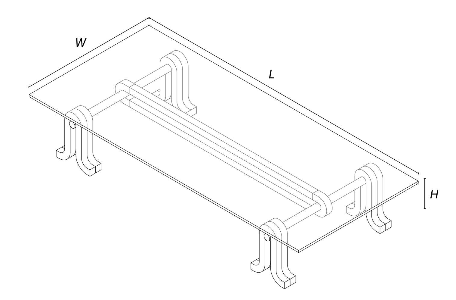 A continuous wooden loop connects these substantial leg supports to create a fluid visual. The glass piece rests on top allowing a clear sightline of the base.